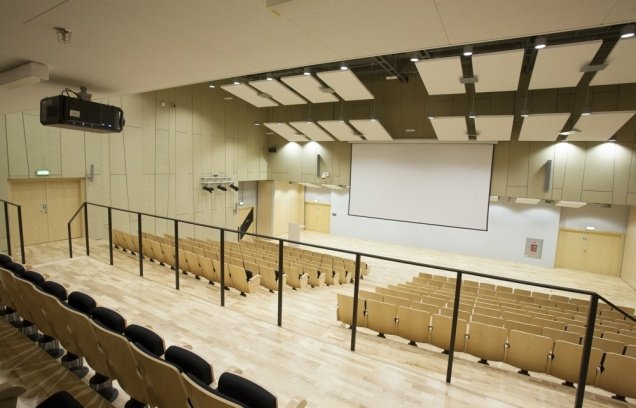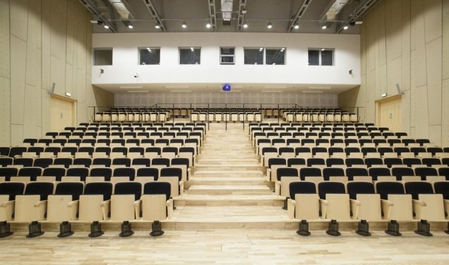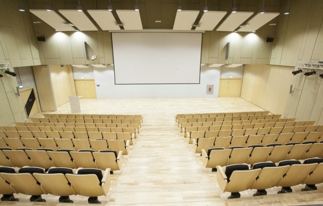 The Auditorium holds 280 upholstered seats, a display screen, a multimedia projector, a lighting system, a speaker’s podium with a microphone, a sound system including six wireless microphones, and three cabins for simultaneous translation including all the necessary sound equipment.